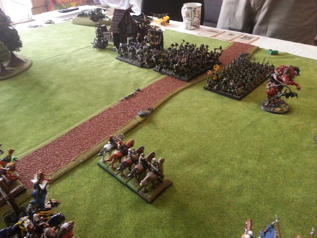 The sound of the bone crushing impact and the roar of the ogre battle cry deafened even the screams of the dead and dying as the battle ground on, but relief for the Empire seemed to be at hand as Imperial Knights approached from the west under the command of the Lector Dieter von Lemann himself, ready to plunge into the ogres' flank. Better still, the Immortals and the halberdiers finally cut down the last of the Ironguts... given time they too could come to the aid of the beleagered Burgomeister's Blackswords.